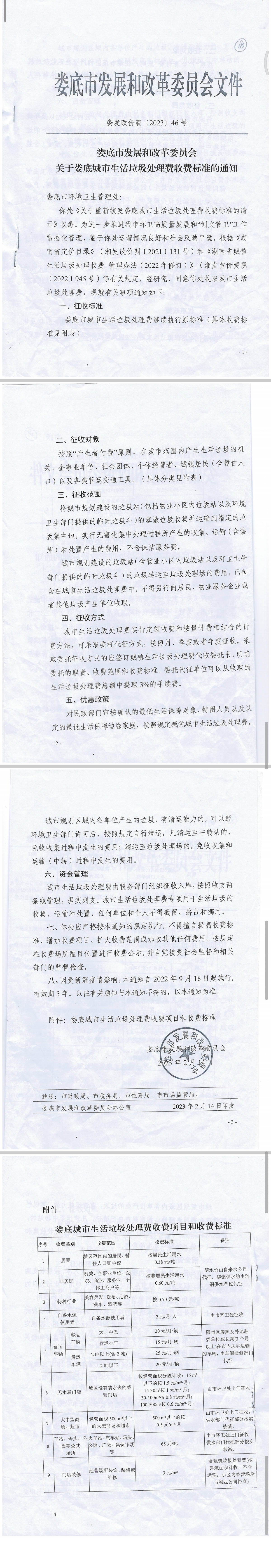 關(guān)于婁底城市生活垃圾處理費(fèi)收費(fèi)標(biāo)準(zhǔn)的通知